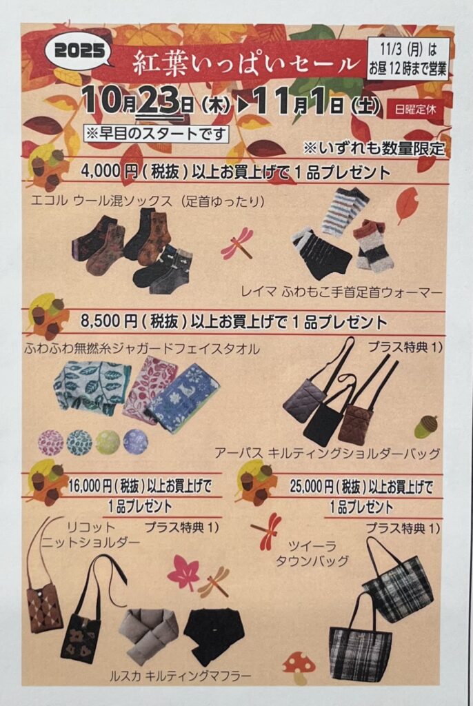 紅葉いっぱいセール 2025年10月19日 最終更新日時 : 2025年10月9日 sudo-hp 10月23日(木)~11月1日(土)日曜定休 紅葉いっぱいセールを開催します 今月は早目のスタートです ●お知らせ● 11月3日(月)はお昼12時までの営業です スタッフ一同お待ちしております
