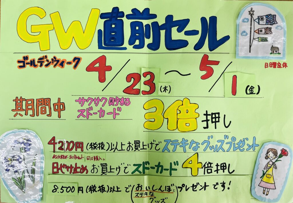 ゴールデンウィーク直前セール 2026年4月18日 最終更新日時 : 2026年4月15日 sudo-hp 4月23日(木)~5月1日(金)日曜定休 ゴールデンウィーク直前セールを開催します ご来店をお待ちしております。